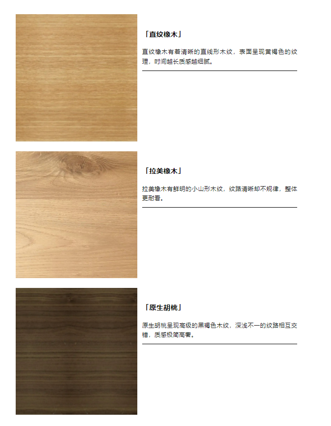 现有的木皮品种非常多,颜色纹理也非常丰富,我们通过对比各类木皮属性,甄选出三款纯天然高端木皮,色泽纹路独特百搭,整体性能稳定实用。《天然木皮系列》三款花色:直纹橡木、拉美橡木、原生胡桃