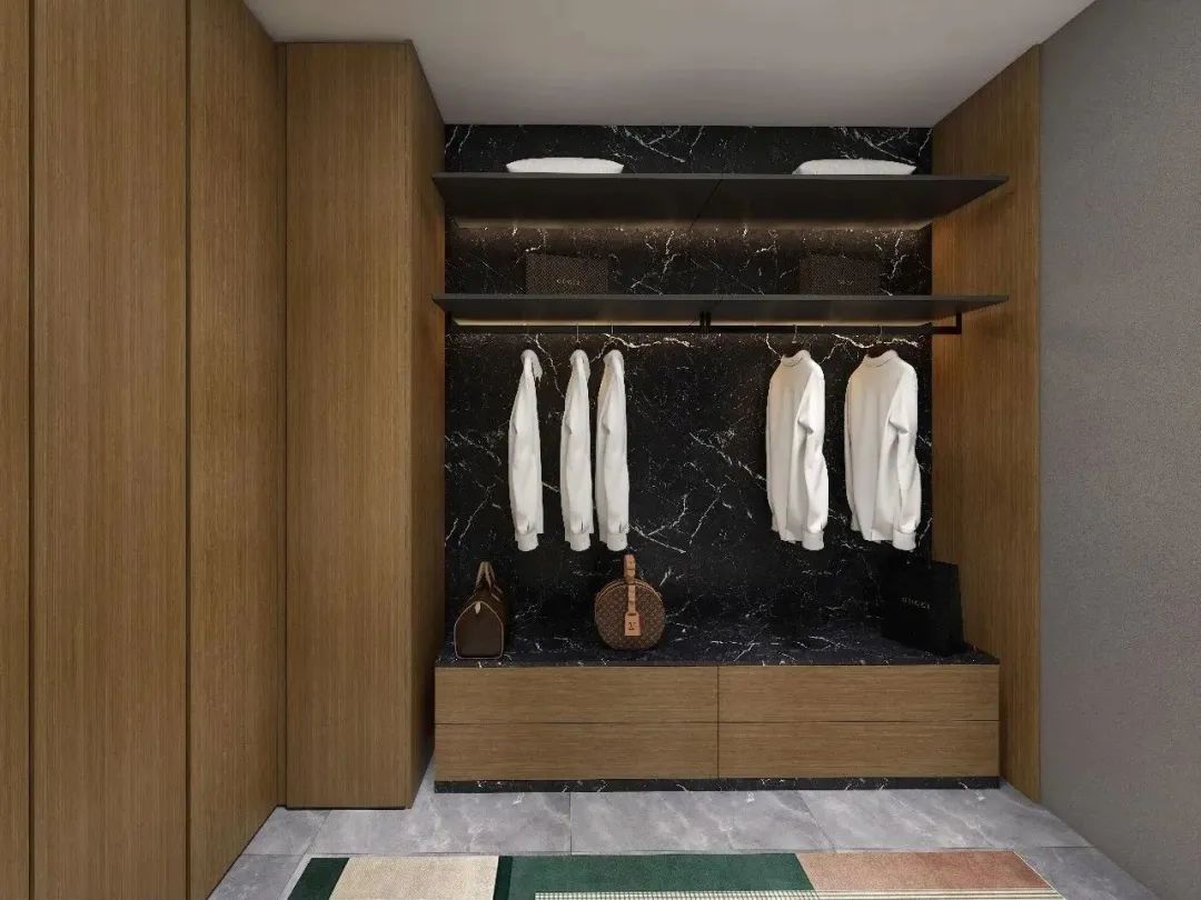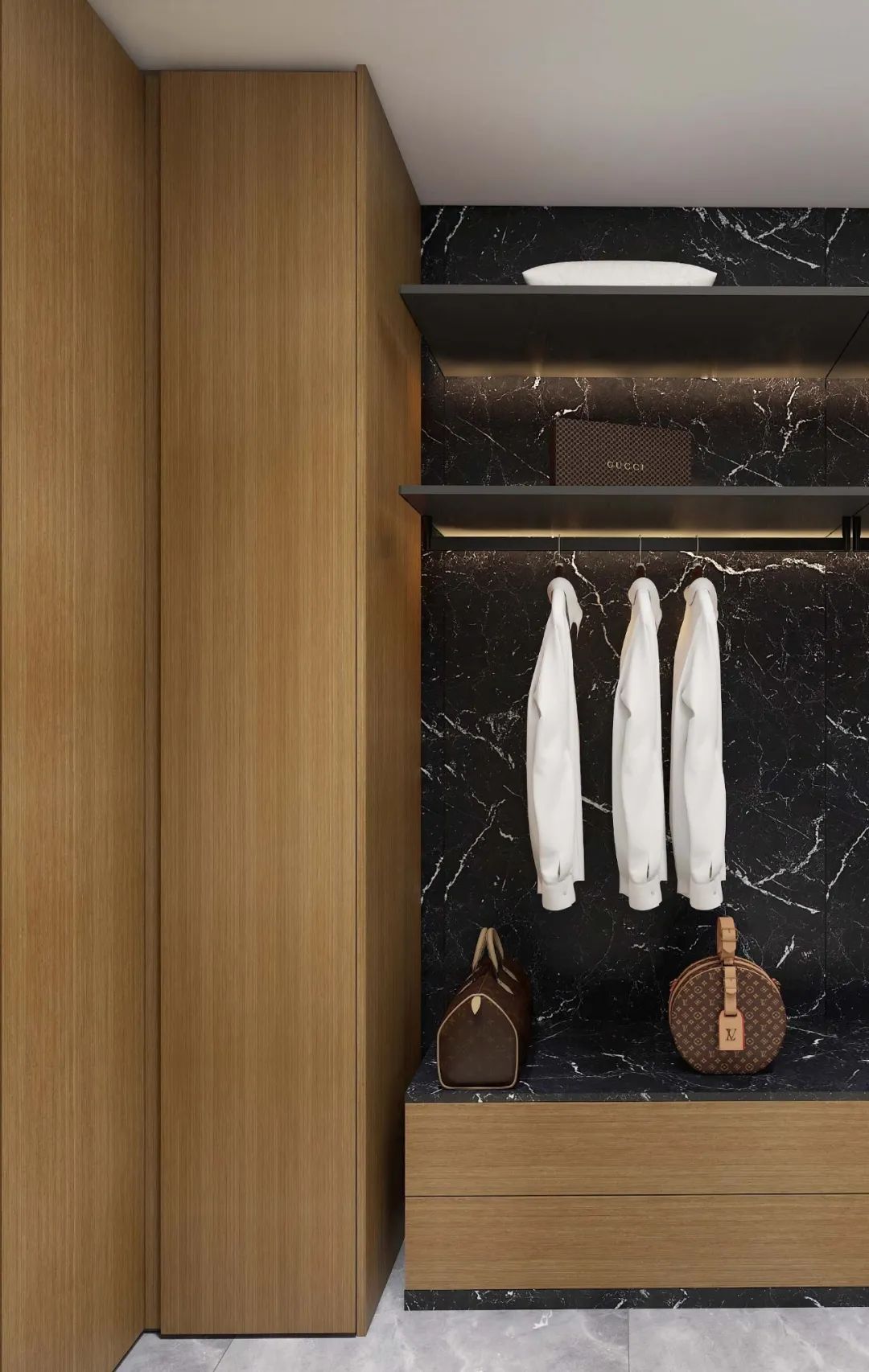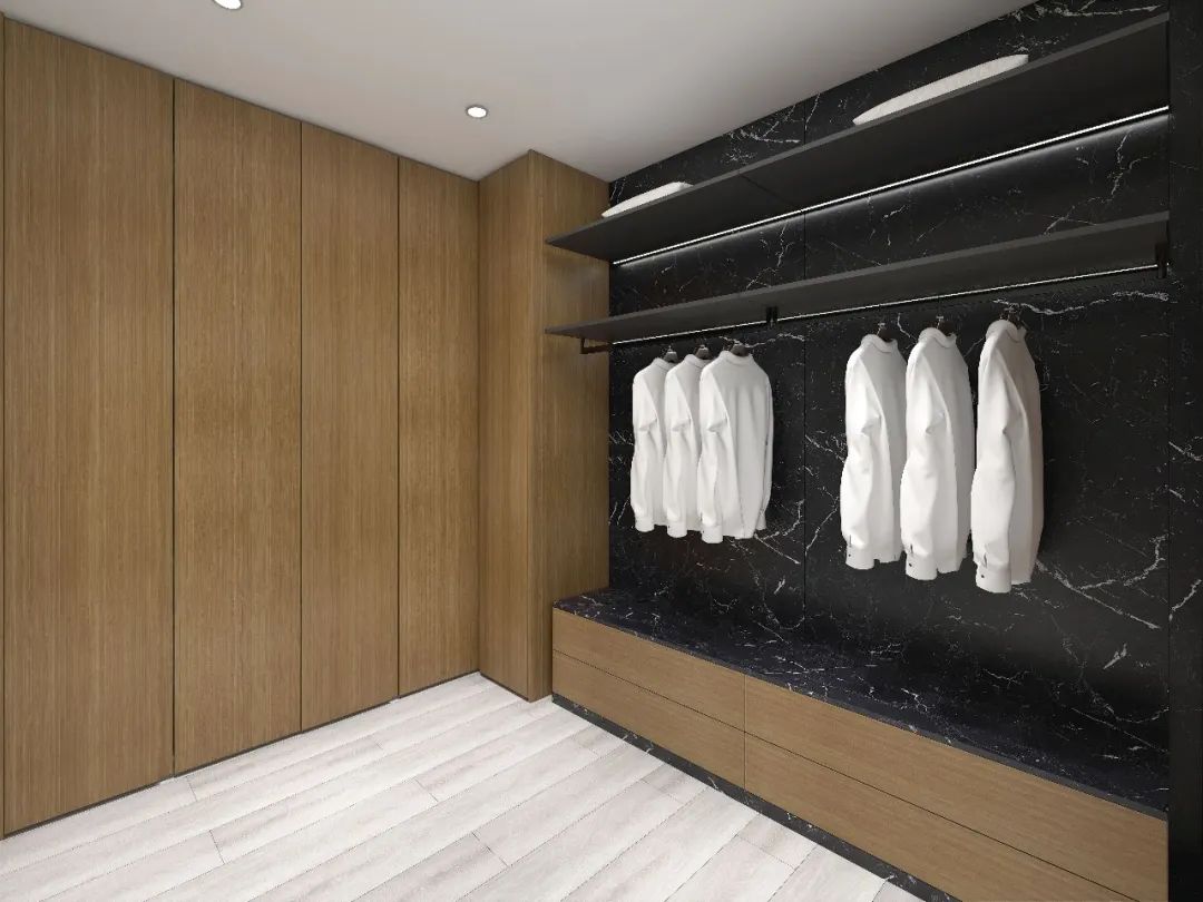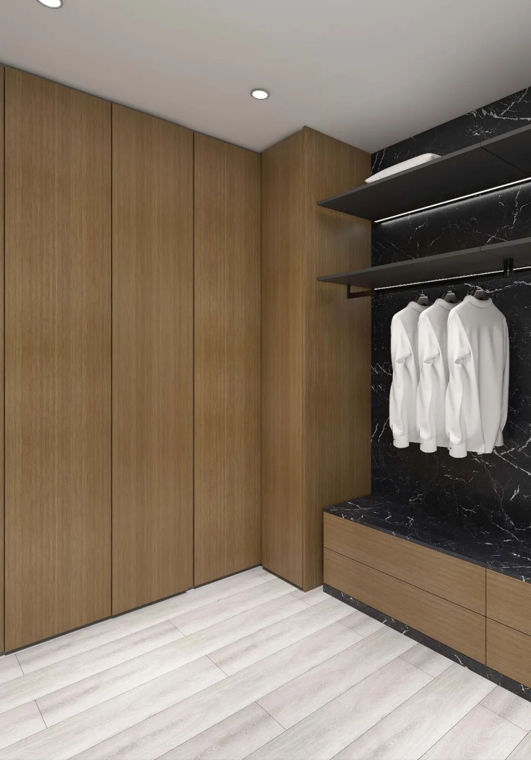 《天然木皮系列》选用竹香板为基材,搭配1mm原生天然木皮饰面,整体厚度达到了23mm,结构相当稳定,可做2730mm一门到顶。同时竹香板有不易变形的特点,解决了后期使用出现陈旧老化等问题,还有防潮、防霉等功能,长期使用也不惧磨损。