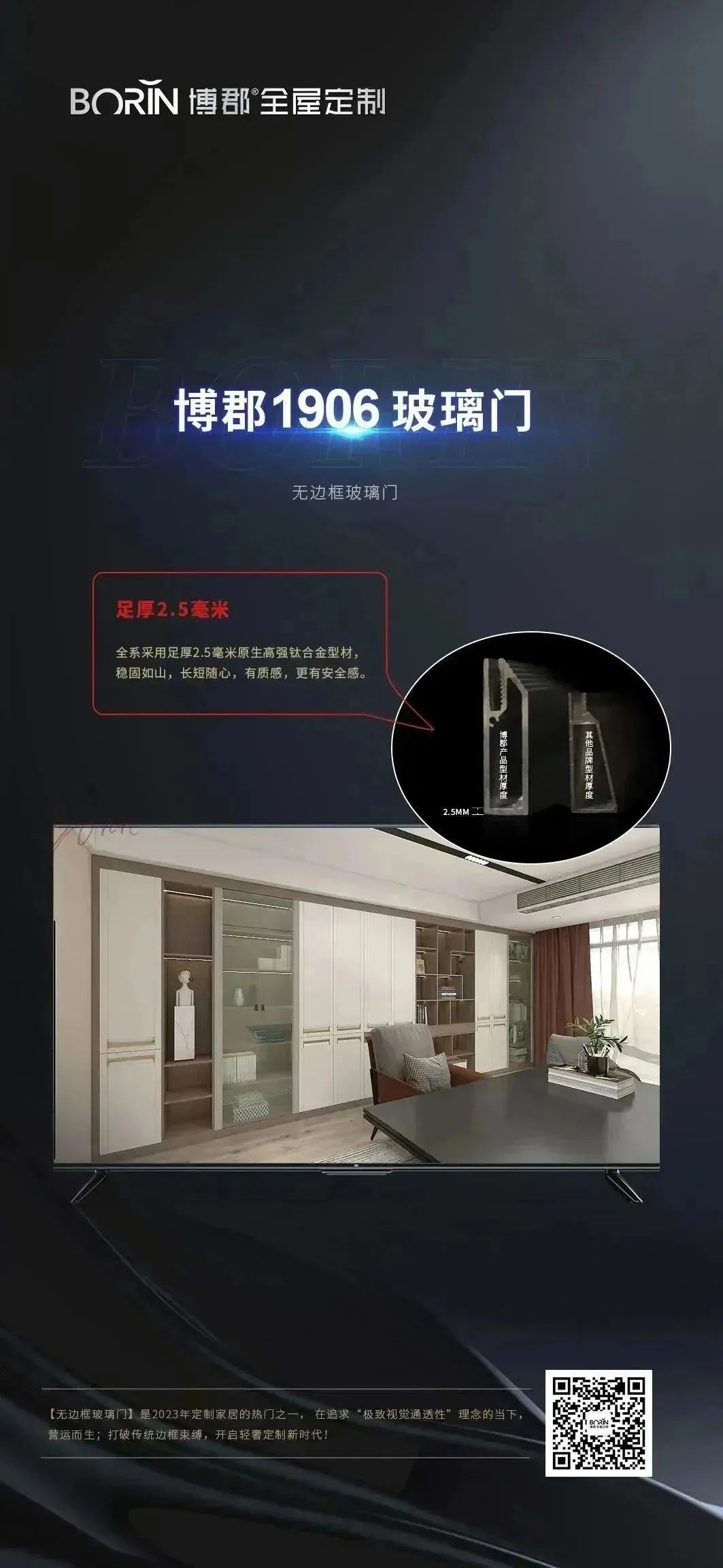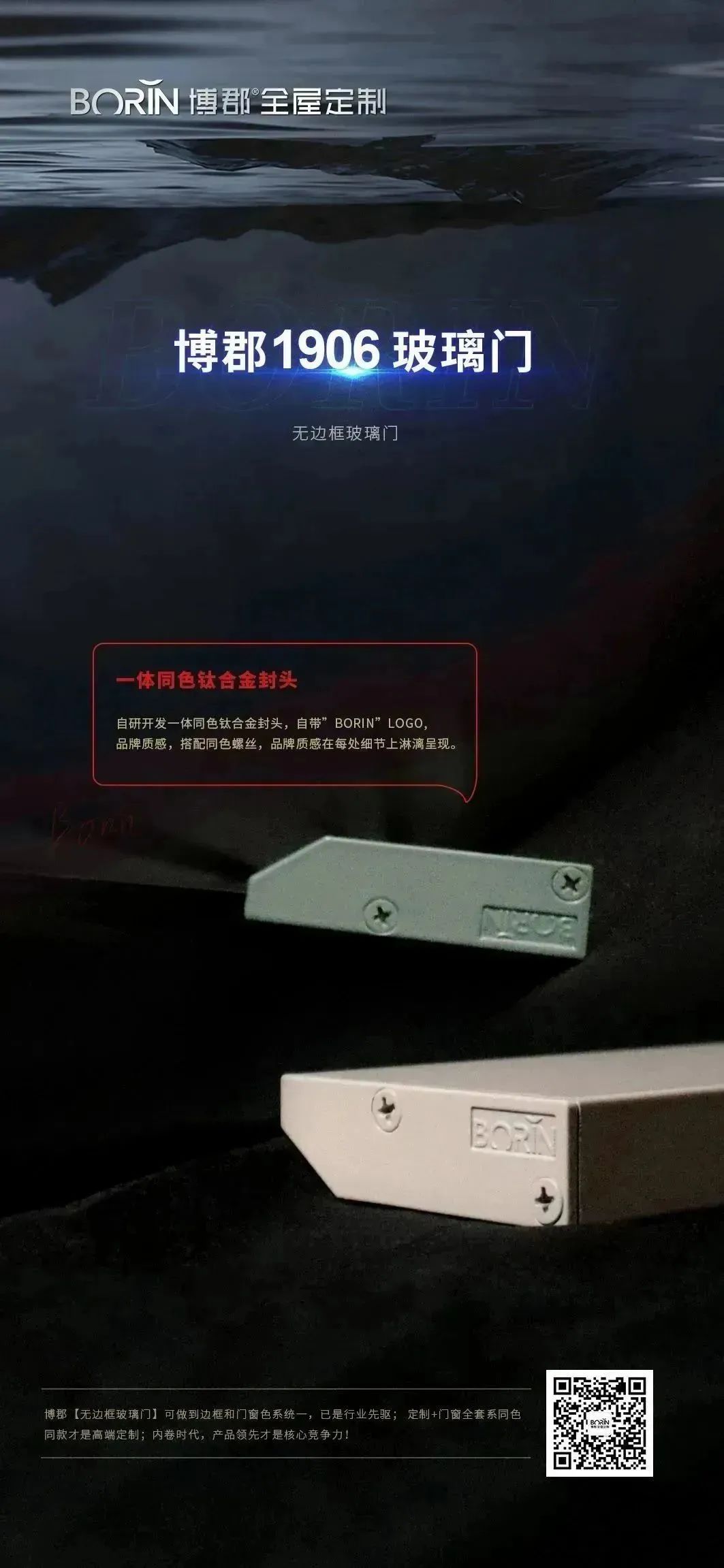 真正的美学是藏在细节深处的,1906玻璃门自研开发一体同色钛合金封头,顶部定制博郡原创LOGO——“BORIN”,搭配同色螺丝,细节构造精巧,品牌质感在每处细节上淋漓尽致,这些不以为然的细节,才是轻奢品质该有的呈现。