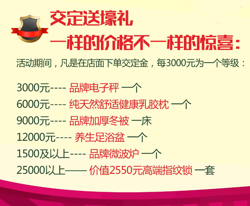 活动期间, 凡是在店面下单交定金,每3000元为一个等级: