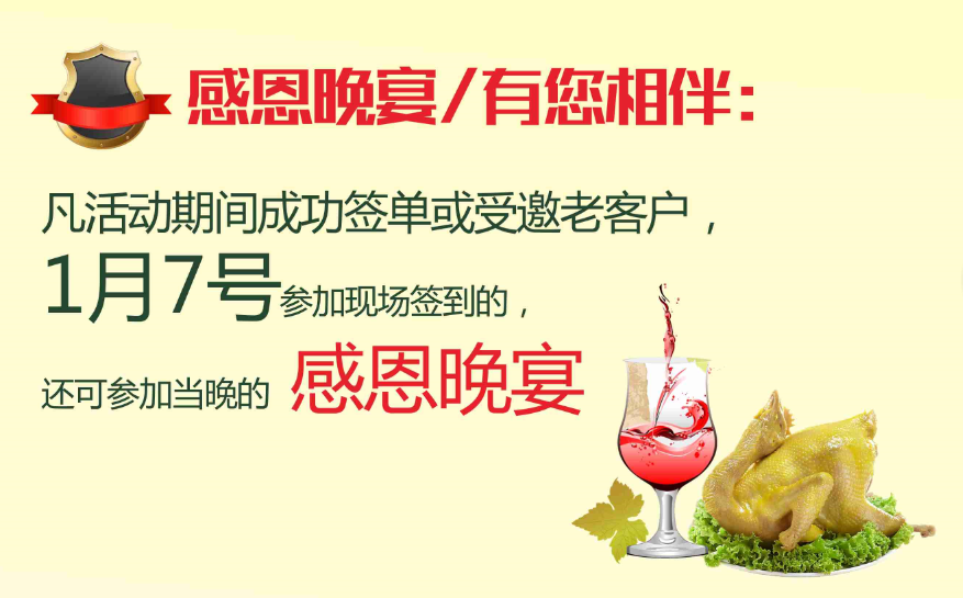 凡活动期间成功签单或受邀老客户,1月7号参加现场签到的,还可以参加当晚的感恩晚宴。(具体详情请咨询客服)