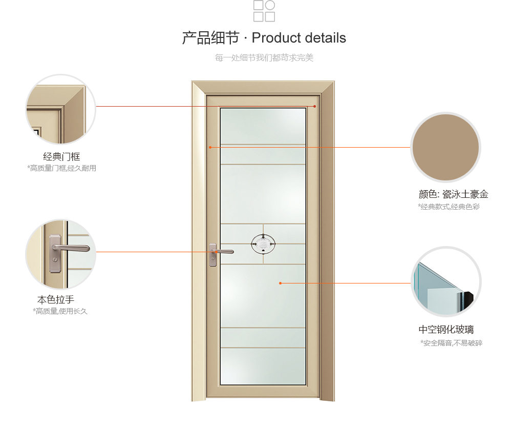 外框采用大斜面,一改以往常用的拱形、凹型、平面造型,立体感十足、线条简洁,彰显大气。领铂系列色彩丰富,包括:玉白肌肤、瓷泳土豪金、砂纹金丝樱桃、银丝水曲柳等能完美地适应各种装修风格,充分满足不同人群的个性化需求。适合现代风格、简欧风格、田园风格、美式风格、中式风格以及混搭风格。